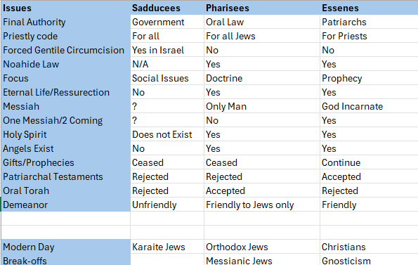 Who were the Essenes? They were simply the “believing” jews that held on to and accepted the patriarchal testaments. People like John the Baptist, the apostles Peter, John, and James. You see, when Jesus was born, the devil had 30 years to form two occults of Judaism prior to the Lord’s ministry. The occults of the Pharisees and the Sadducees. The Pharisees ended up in control over the Jewish government at the time of Christ’s ministry. The Apostle Paul was actually a Pharisee, but he perhaps became one of the most influential apostles of all after Jesus showed him the truth. God will use whom He will use. Interestingly, the devil has had two thousand years to corrupt the “Church” that Jesus left upon His death. Just look at all the denominations. Here is a chart outlining the differences in the Jewish sects.