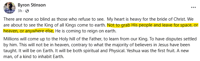 It is amazing to me how one man that got his theology wrong can affect the entire world. The most supporting evidence is this post on Facebook from Byron – shown partially.