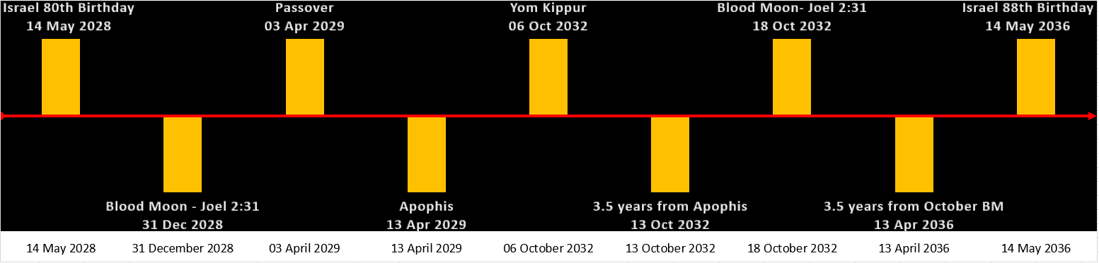 It was mentioned that Apophis could be used during the G&M war with the Tribulation commencing just days after in April of 2029. Ten days prior to April 13th of 2029 is Passover. If we take the date of Apophis Friday April 13, 2029, and add 3.5 years to the mid-point of the Tribulation, we arrive at October 13, 2032. Exactly 7 days prior on October 6th or the 22nd of Tishrei is Israel’s most holy day of Yom Kippur, a day of fasting, repentance, and atonement, when the high priest enters the Holy of Holies to offer sacrifices for Israel’s sins.