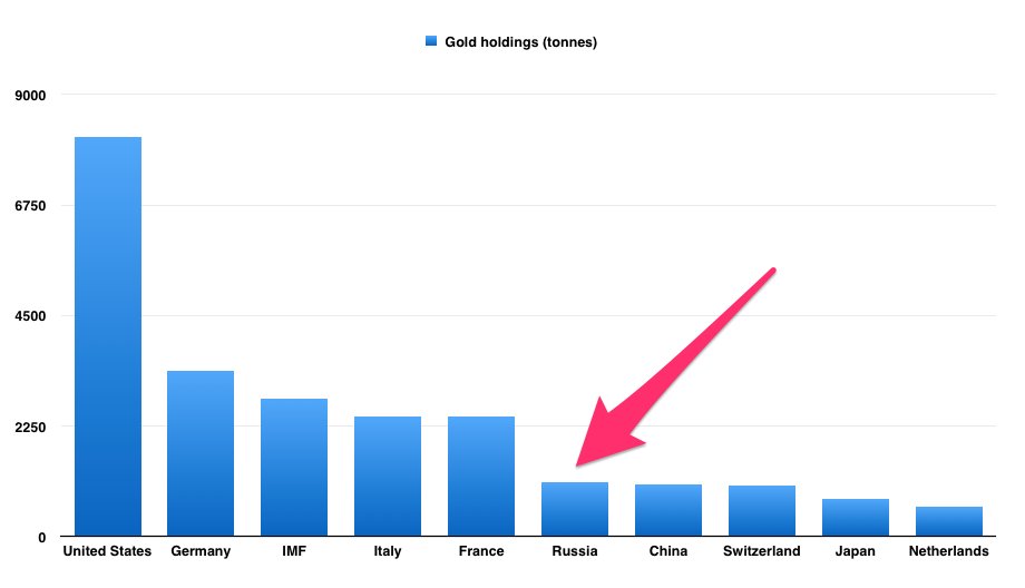Since September 2012 Russia has been quietly building up its gold reserves, hitting 1,149.8 tonnes last month — its highest level since 1993. In the process the country has overtaken both Switzerland and China on its way to amassing the sixth-largest gold reserve pile in the world.